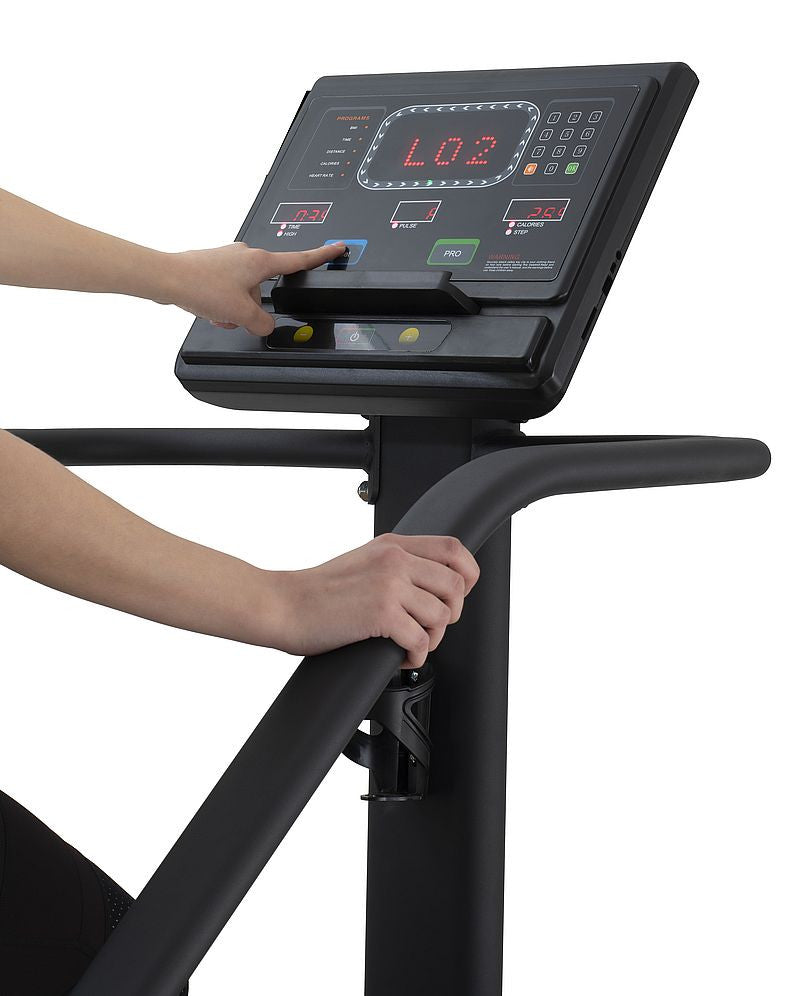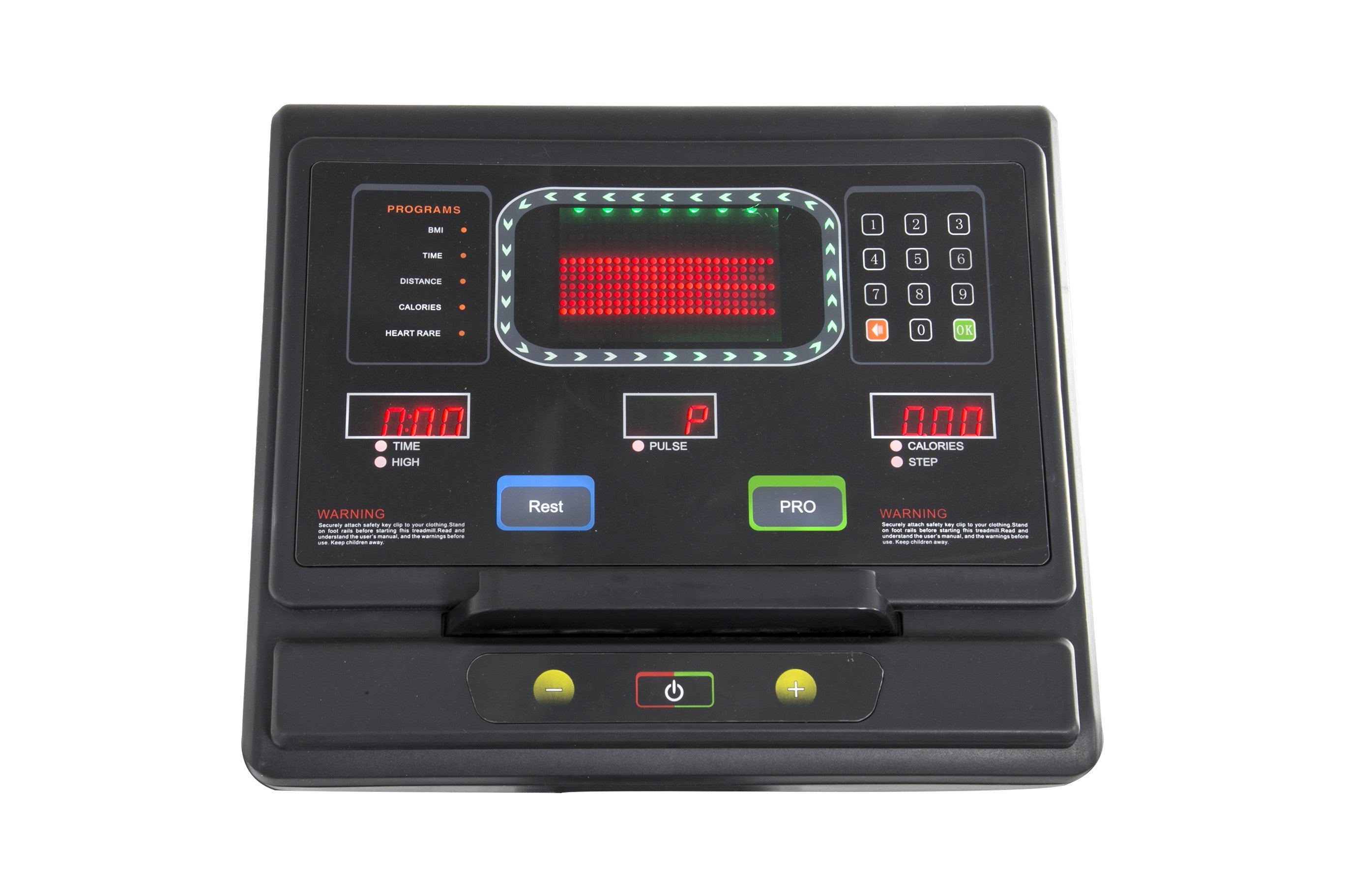 E' dotato di schermo di 13,5 x 7 cm in cui è possibile visualizzare i propri parametri di allenamento come: tempo, distanza, calorie, frequenza cardiaca e livello difficoltà. Offre inoltre 8 programmi preimpostati, 1 programma manuale e 3 programmi utente.