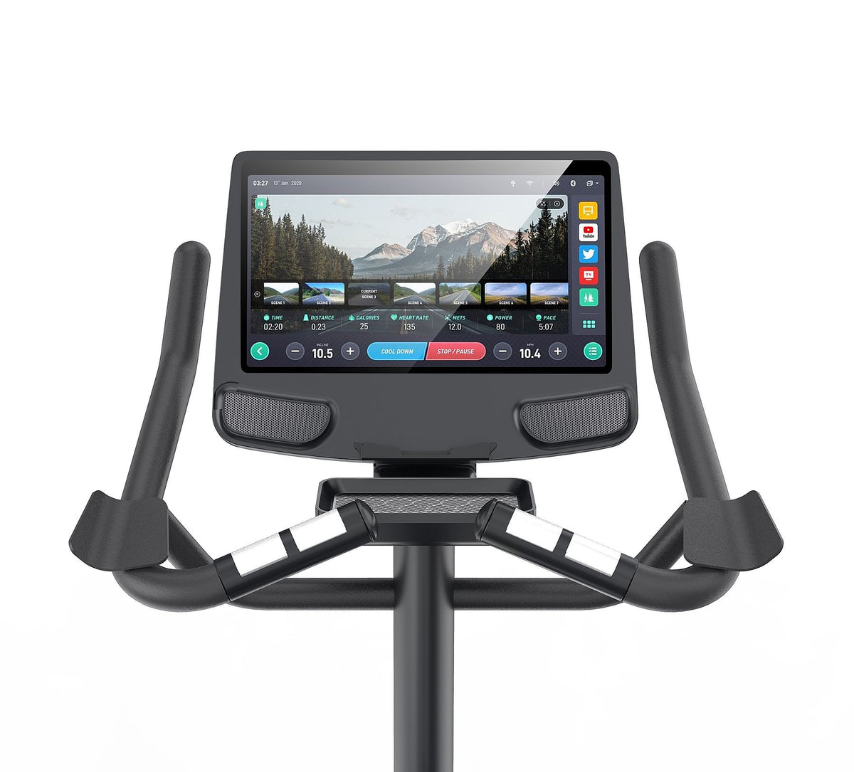 - Accessori Connessione Wifi + Apps preinstallate (Chrome, Netflix*, Spotify*, Facebook, Amazon Video*, YouTube, Twitter, Kinomap*, Instagram, Cast Screen) / ricarica wireless smartphone / modulo integrato per fascia cardio wireless / casse audio Hi-Fi / output auricolari wireless / portaborraccia / supporto per smartphone e tablet