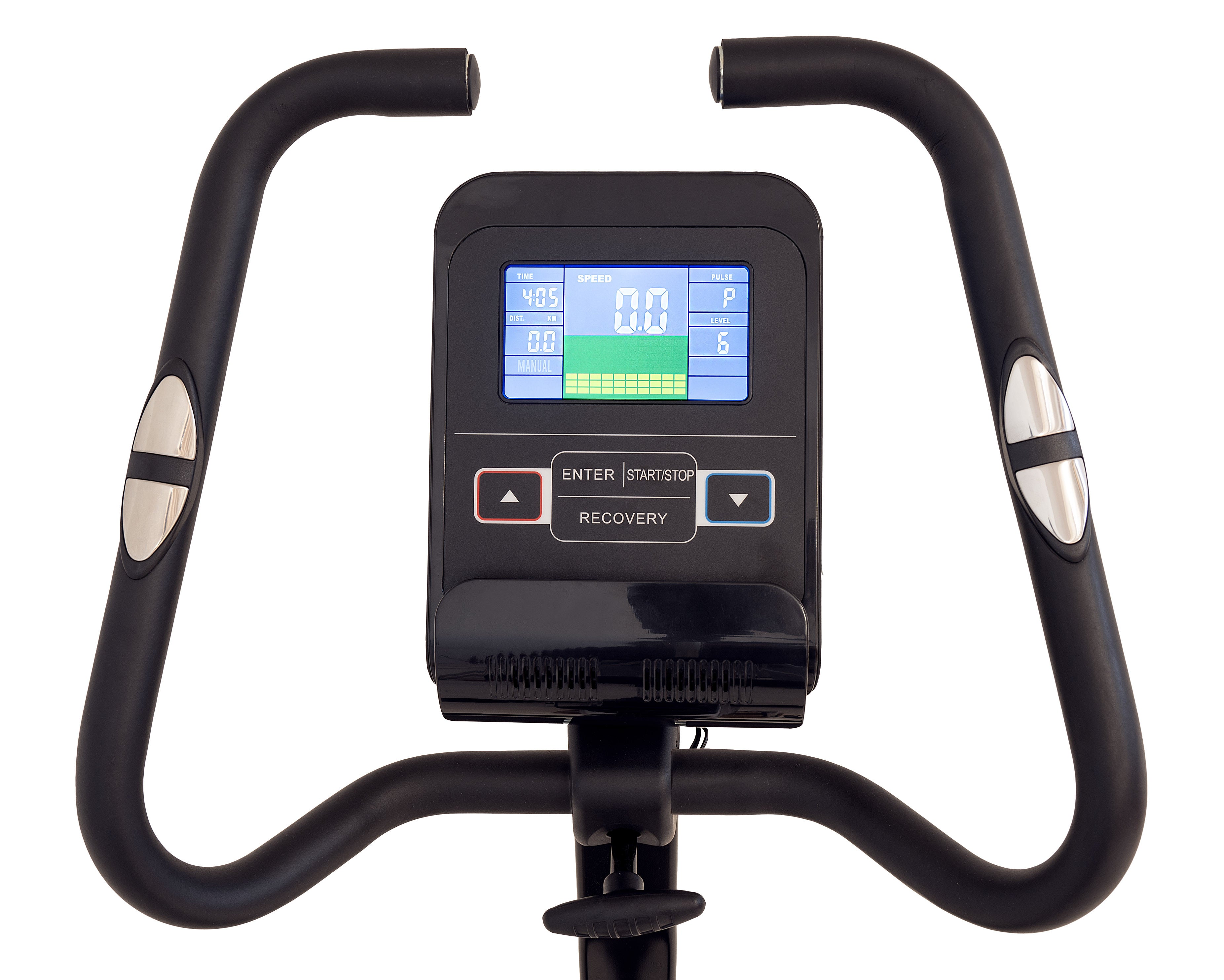 DATI VISUALLIZZATI tempo, velocità, distanza, frequenza cardiaca, calorie, RPM, Watt, livello resistenza, n° prog, diagramma programmi