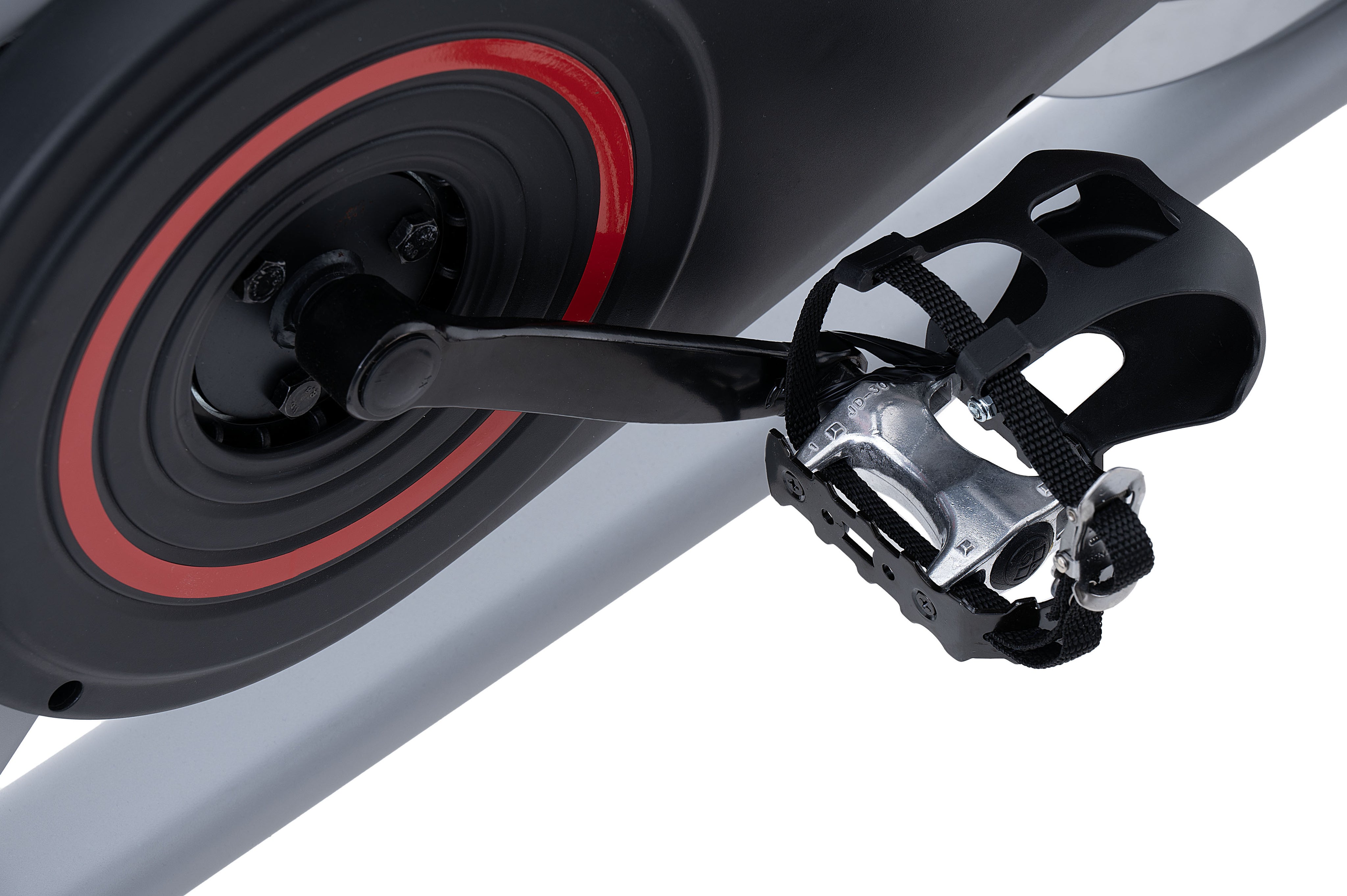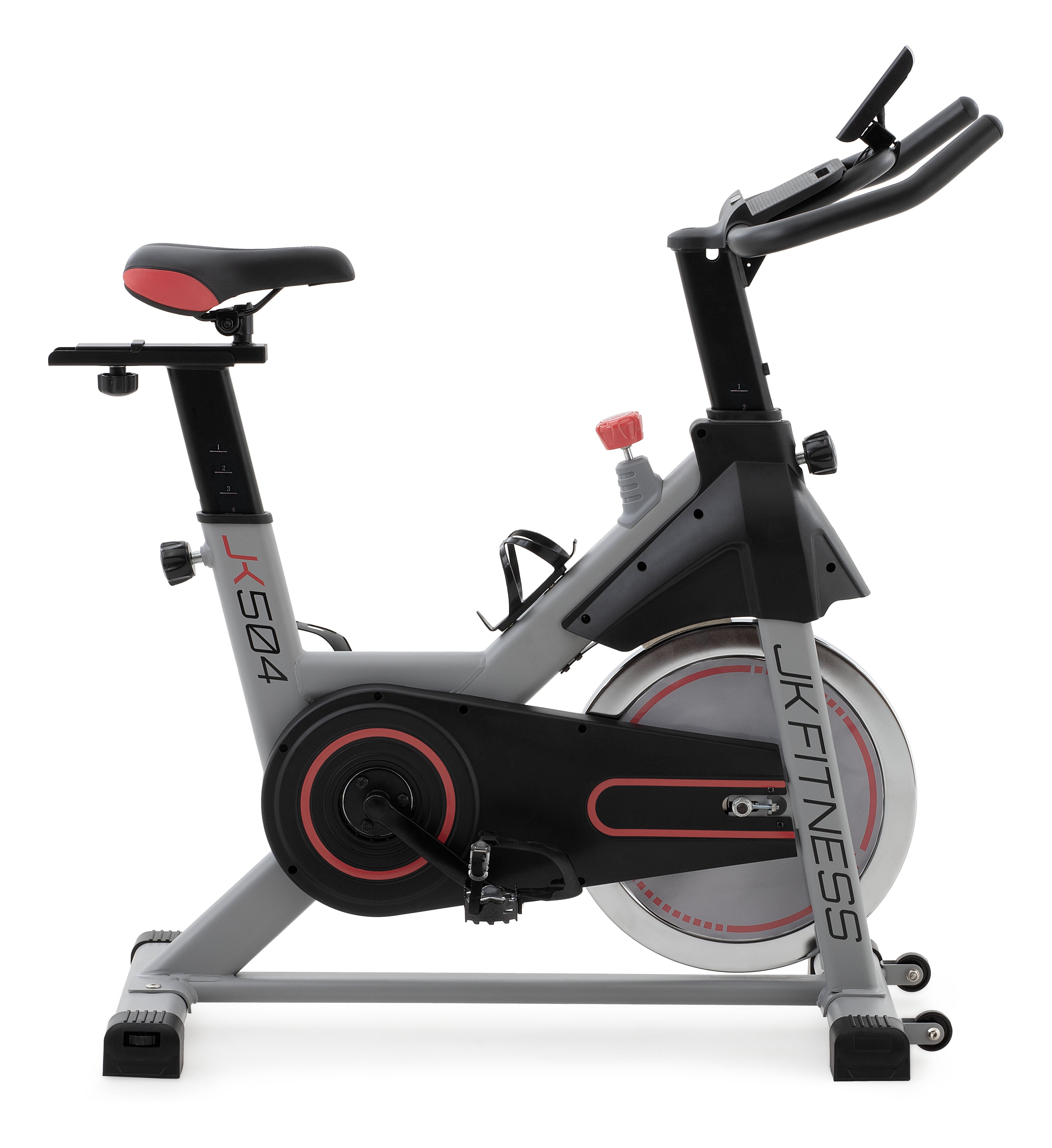 La nuova JK 504 è una spin bike tradizionale con freno meccanico a tampone e trasmissione a scatto fisso con cinghia silenziata, monta un sistema inerziale con massa volanica da 18 kg (volano bilanciato) e una pedivella da 17 cm, che generano una buona fluidità della pedalata a tutte le andature. La regolazione dello sforzo avviene tramite un comando con selettore manuale a resistenza “millimetrica” che funge anche da freno di emergenza in caso di arresti repentini della pedalata da parte dell’utilizzatore. La nuova spin bike JK 504 ha la regolazione in altezza della sella su 7 posizioni (misura della gamba da 72 cm a 90 cm) e in profondità 7 cm, il manubrio si regola in altezza su 5 posizioni ed è rivestito in morbida gomma antiscivolo; queste regolazioni servono per trovare la migliore postura in sella dell’utilizzatore. La sella racing design, anatomica e con foro centrale, aiuta e migliora la sensazione a bordo a tutti gli utenti, garantendo confortevoli e lunghe pedalate senza fastidi. Il pedale racing antiscivolo in ferro con cinghietto ferma piede, aiuta a mantenere il corretto appoggio della scarpa in tutte le fasi della pedalata, anche in quelle più intense.