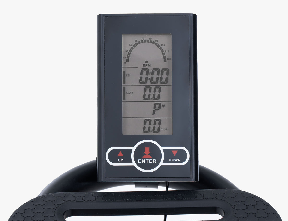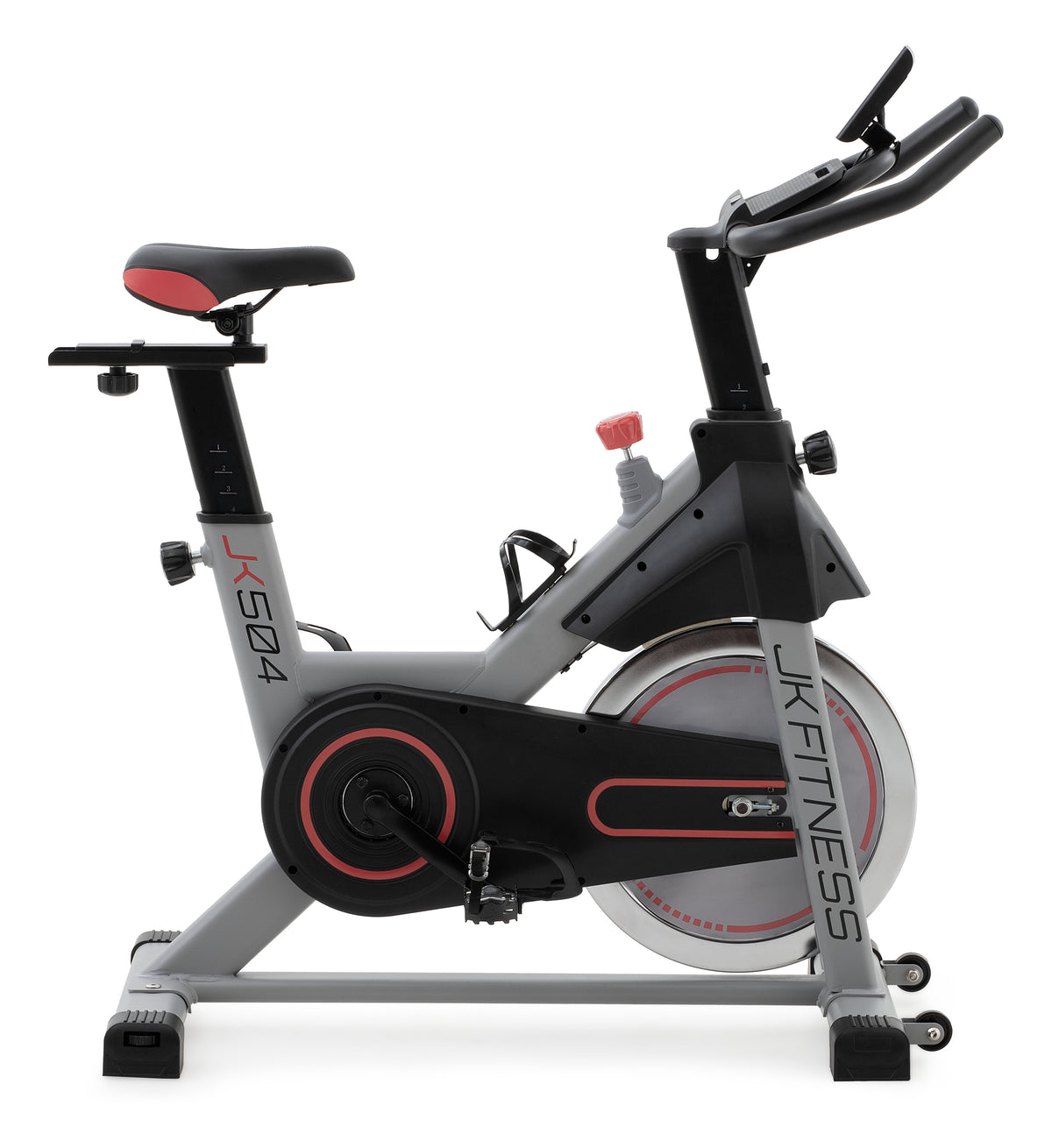 La gym bike JK 504 è dotata di ciclo-computer con display LCD multi-informazione è abbinato anche ad un supporto porta cellulare / tablet e permette di monitorare in tempo reale tutti i parametri dell’allenamento, quali: tempo, distanza, velocità, RPM, calorie e frequenza cardiaca.