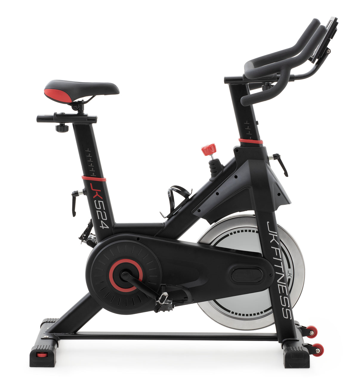 Il robusto telaio in acciaio della JK 524 poggia su ampi stabilizzatori con quattro piedini antiscivolo (posteriori autolivellanti) permette di sorreggere un peso max utilizzatore di 130 kg, mentre nella parte anteriore ci sono due ruote di trasporto, che permettono facili spostamenti della spin bike JK 524 da un locale all’altro. La nuova fitness bike JK 524 è una spinning magnetica che pesa 37 kg ed è poco ingombrante 117 x 51 cm H 130 cm; in pratica perfetta per chi vuole una prestazione al top ma non dispone di ampi spazi a casa. JK Fitness offre le migliori spin bike sul mercato con un perfetto rapporto qualità/prezzo.