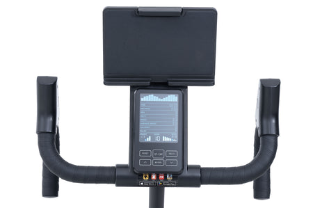 Il ciclo-computer con un grande display LCD multi-informazione è inserito nella console con un supporto porta cellulare / tablet regolabile, permette di mantenere sotto controllo tutti i parametri dell’allenamento cardio, quali: tempo, distanza, velocità, velocità media, RPM, calorie, Watt, frequenza cardiaca, marcia/livello resistenza, rapporto corona/pignone. La gym bike JK 534 è dotata di un sensore nella console per rilevare la frequenza cardiaca dell’utilizzatore tramite la fascia cardio durante le sessioni di un allenamento cardio più intenso; la fascia cardio è optional da acquistare separatamente.