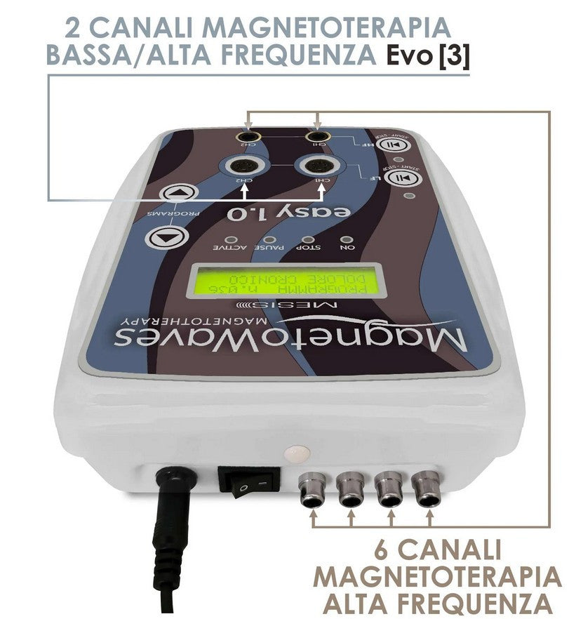 La Magnetoterapia CEMP MagnetoWaves Easy 1.0 dispone di nuovi accessori della linea MAGNETOMIX™ (miscela magnetica) che grazie alla funzione Evo [3], consentono di utilizzare l’emissione di magnetoterapia in Alta frequenza (HF), Bassa frequenza (LF) o il mix delle due, cioè le “Armoniche” (HF+LF). Queste ultime, hanno la capacità di innescare la biorisonanza nei tessuti, contribuendo all’assorbimento, da parte delle cellule, dell’energia di cui hanno bisogno per ricaricarsi, coadiuvando quindi l’azione terapeutica con risultati che difficilmente le sole basse frequenze potrebbero dare. Abbiamo categorizzato le “Armoniche” con il termine SuperTerapia™, in quanto determinano un trattamento innovativo che ha potenzialità importanti nella cura delle patologie e come antidolorifico. (Acronimi utilizzati per definire la magnetoterapia: CEMP, Campi Elettromagnetici Pulsati o in inglese PEMF e EMF). Dispositivo per magnetoterapia CEMP MESIS MagnetoWaves con una potenza massima di emissione in Bassa frequenza di 250 gauss max per canale e un range in Alta frequenza da 8Hz a ben 15.000Hz, 10 canali di cui 6 in alta frequenza e 2 in alta e bassa frequenza.