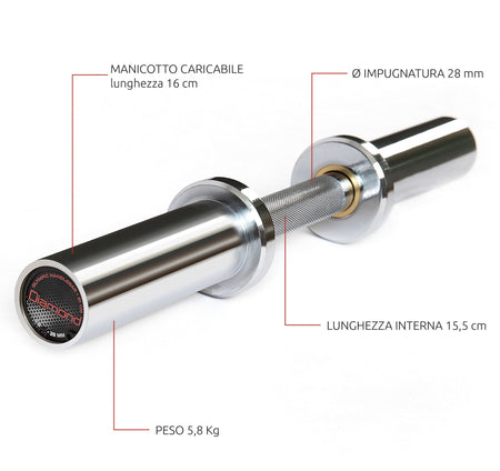 Il Manubrio Caricabile Olimpico è un classico delle sale pesi e degli ambienti dedicati alla muscolazione. Questo tipo di manubrio cromato con manicotti da diametro 50 mm e bronzine, rappresenta un’ottima soluzione nell’unione di eleganza e finalità. L’impugnatura zigrinata dal diametro di 28 mm permette all’atleta di avere un elevato grip senza stressare eccessivamente le mani, mantenendo il massimo controllo durante l’esercizio.