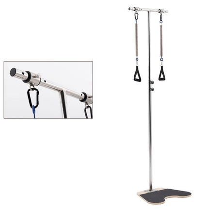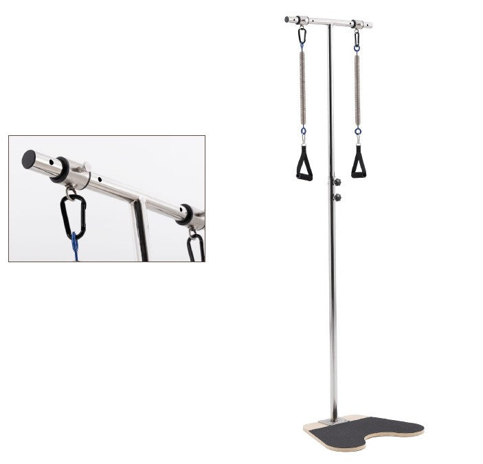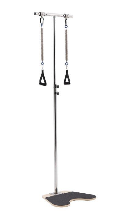 Il Ped-o-Pull aiuta a percepire e correggere l’allineamento del corpo, in particolare della colonna vertebrale e del cingolo scapolare, sfidando la stabilità in posizione eretta. L’attrezzo è composto da una base in legno e un palo in acciaio verticale, a cui sono collegate delle molle con maniglie. La posizione delle molle è regolabile e viene utilizzata per eseguire una varietà di esercizi in piedi, che coinvolgono resistenza per le braccia e il rafforzamento del busto. Struttura in acciaio, regolabile in altezza, poggiata su una pedana in legno di quercia con rivestimento antiscivolo. Ampiezza dell’attacco delle molle regolabile tramite pin di selezione. Possibilità di ancoraggio a muro per una maggiore stabilità. Migliorare la coordinazione, l’equilibrio generale e la forza, tonifica il busto e la parte alta del corpo migliorando la postura. Il Ped-o-Pull permette distensioni ed allungamenti in posizione eretta mediante esercizi mirati. I muscoli che supportano le articolazioni possono rafforzarsi in modo sicuro, senza stress o traumi.