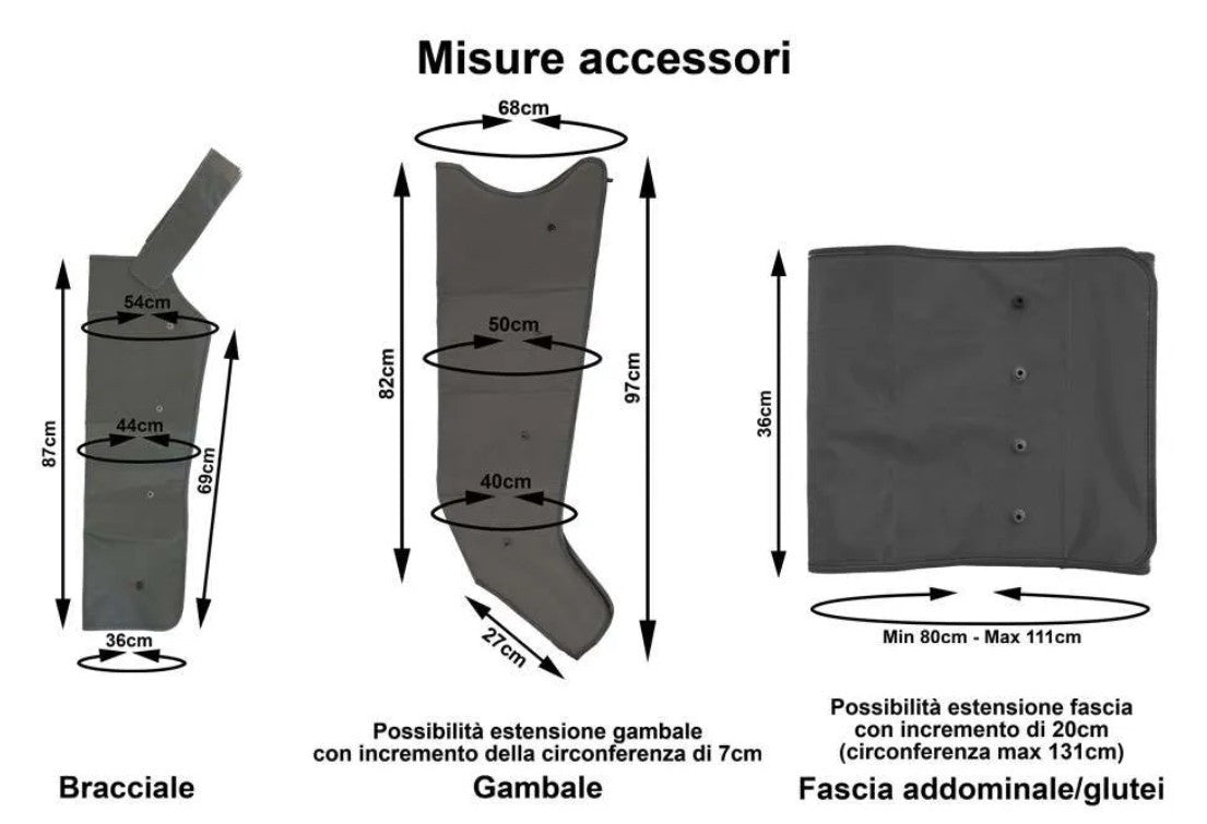 - Dotazione ADVANCE: apparecchio per pressoterapia con 2 gambali, 1 fascia addominale glutei e Telecomando