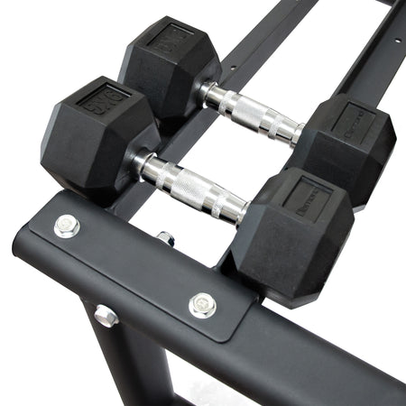 - Specifiche 3 ripiani - 15 coppie manubri - è possibile rimuovere le sedi per aumentarne la capienza o alloggiare manubri a testa esagonale