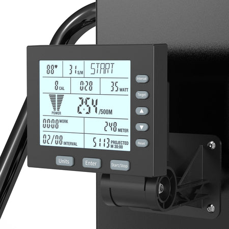 - Visualizzazione Tempo / Distanza / Calorie / Calorie per ora / Watt / Media Watt / SPM / Tempo per 500 m / Media tempo per 500 m / Frequenza cardiaca / Previsione distanza in 30’