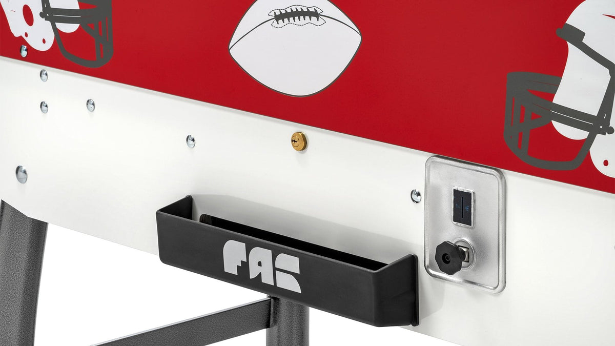Il TAM TAM Fas con gettoniera è un gioco divertente e robustissimo ideale per sfide appassionate di giocatori di ogni età. Lo scopo del gioco è quello di mettere la pallina nella porta avversaria utilizzando due comode manopole che scorrono su un’ asta in acciaio, parallelamente rispetto al campo gioco.