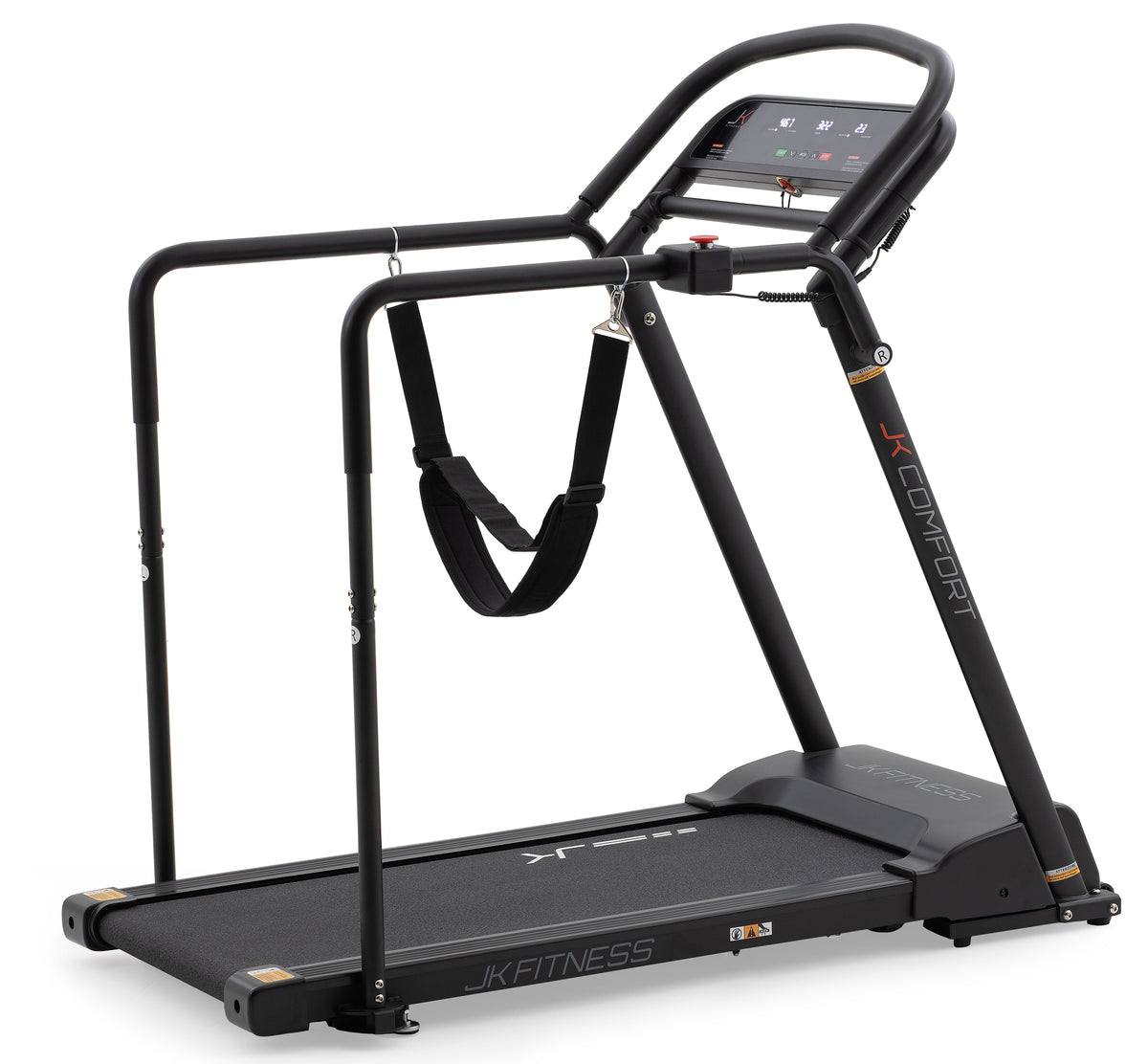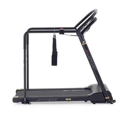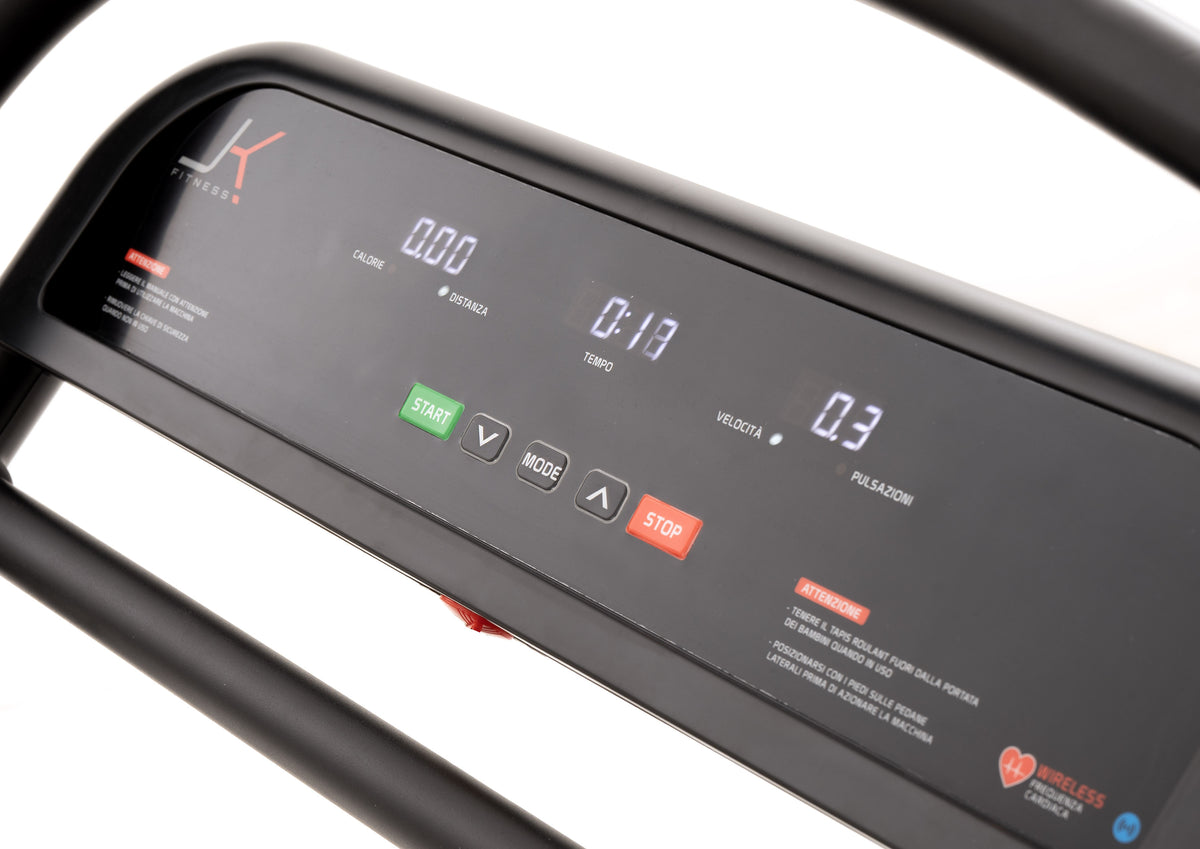 Il nuovo tapis roulant JK Comfort nasce per ampliare la gamma home fitness migliorando le prestazioni per tutti gli utilizzatori che desiderano camminare in piena sicurezza; il tutto con un nuovo look dinamico ed elegante. Il JK Comfort è un tapis roulant elettrico di fascia media nel mondo home fitness equipaggiato con un potente motore da 2.5 HP con un picco massimo di 3.5 HP che permette di raggiungere una velocità di 8 km/h, con regolazione ad incrementi one-step di 0,1 km/h. Questo modello rientra nella categoria “camminatori”, ovvero tutti i tapis roulant studiati per far camminare le persone in piena sicurezza, con una motorizzazione adatta all’uso prolungato a basse velocità. La pedana di corsa ribassata rispetto al pavimento garantisce l’estrema facilità ad ogni utilizzatore a salire a bordo, in oltre i pratici maniglioni antiscivolo longitudinali che affiancano il piano corsa, rendono il tapis roulant estremamente sicuro ad ogni utilizzatore. Per la massima praticità dell’utilizzatore il JK Comfort è dotato di una serie di pulsanti sulla console per regolare la velocità, ed un pratico pulsante stop di emergenza sul maniglione laterale destro. La superficie di corsa di 48 x 110 cm, con nastro spesso 1,6 mm anti-slip, permette confortevoli allenamenti in piena sicurezza grazie anche al sistema di ammortizzazione dotato di 8 tamponi in gomma, che riesce a limitare i piccoli microtraumi dovuti all’impatto del piede durante la camminata. Il quadro di comando del nuovo JK Comfort ha una console con tre finestre a led bianchi multi- informazione, per mantenere sotto controllo tutti i parametri dell’allenamento cardio quali: tempo, distanza, velocità, calorie bruciate, frequenza cardiaca. Il tapis roulant JK Comfort è dotato di due ricevitori integrati: per collegare i propri dispositivi elettronici (APP, social e musica); e 5.3 kHz per la rilevazione della frequenza cardiaca tramite la fascia cardio toracica offerta di serie. Il tapis roulant JK Comfort per essere più vicino alle esigenze e necessità di ogni utilizzatore, è equipaggiato con una serie di programmi per rendere ogni allenamento, il “tuo” allenamento! Sono in dotazione: 1 programma manuale dove tutte le funzioni sono interamente gestite dall’utilizzatore in ogni momento; 3 programmi a target tempo, distanza, calorie; 1 programma HRC. La console è dotata di due casse audio HI-FI, due vani porta borraccia/oggetti. È possibile connettere alcune fitness App motivanti per rendere le sessioni di allenamento stimolanti e interattive, quali: Zwift, Kinomap (abbonamenti non inclusi). Il JK Comfort ha una struttura robusta in acciaio (57 kg) permette l’uso a persone fino a 135 kg; l’ingombro del tapis roulant in uso 147 x 81,5 x 133 cm; in dotazione 2 ruote anteriori per i piccoli spostamenti dell’attrezzo. JK Fitness offre i migliori tapis roulant sul mercato con un perfetto rapporto qualità/prezzo.