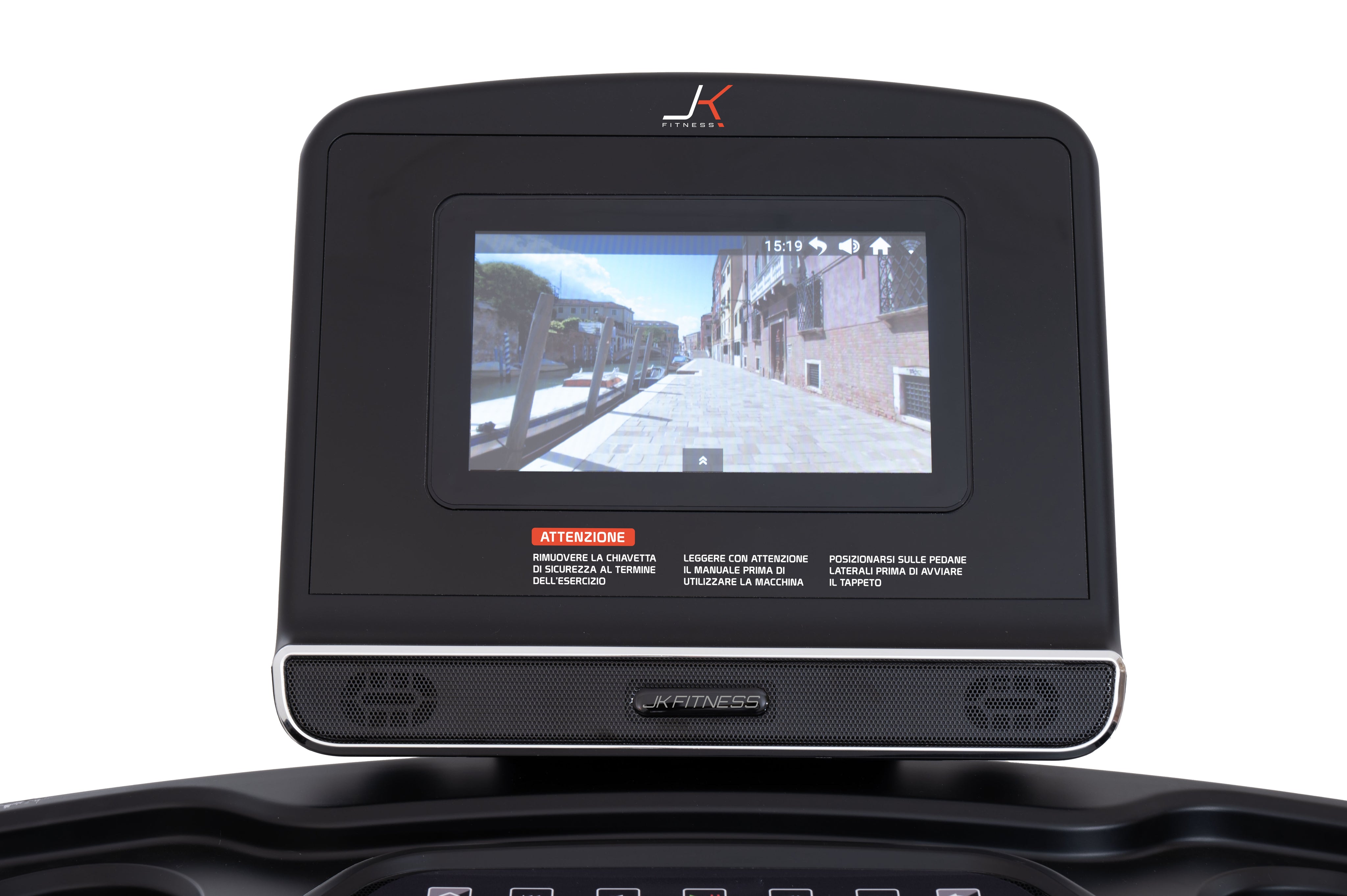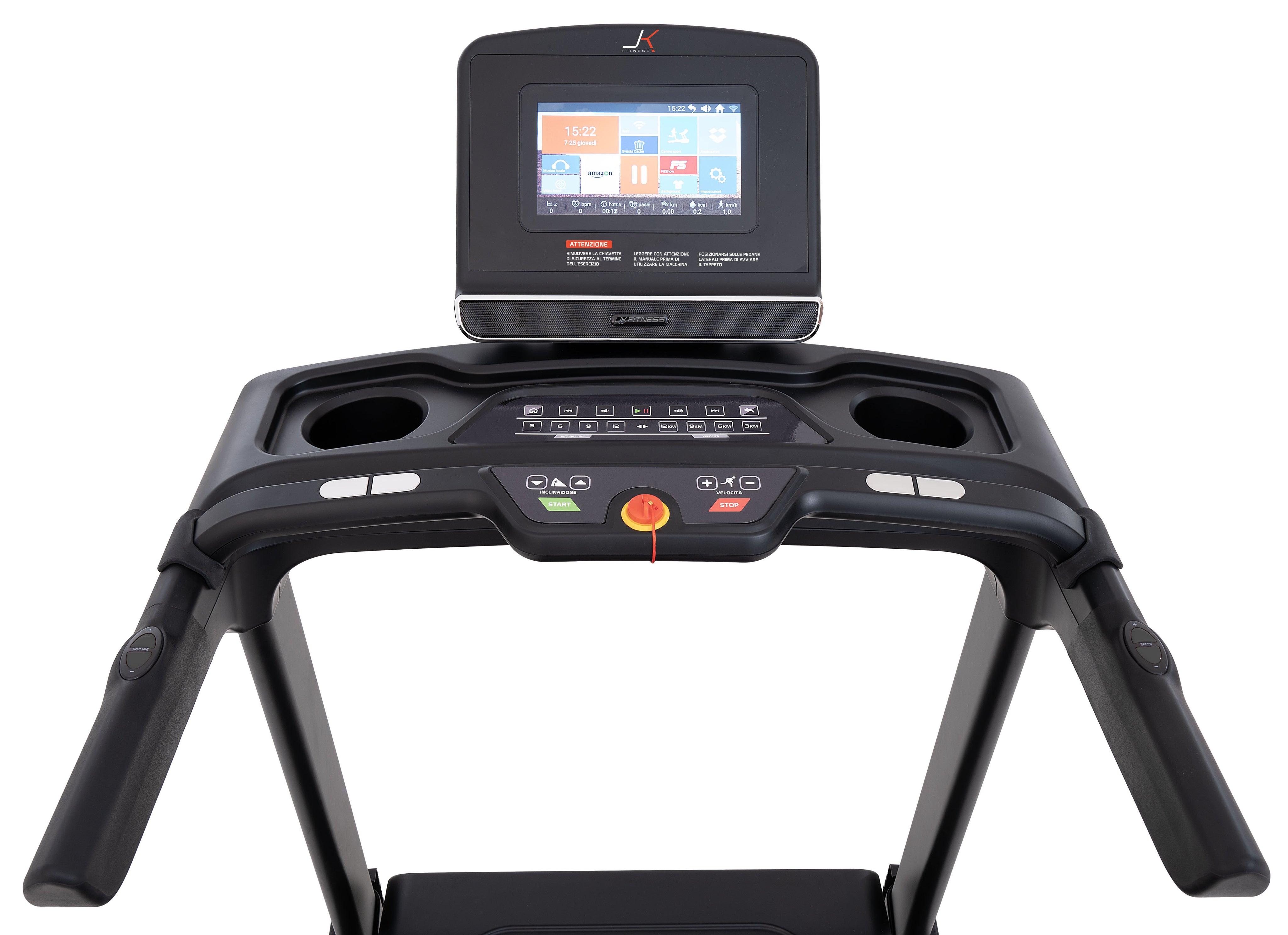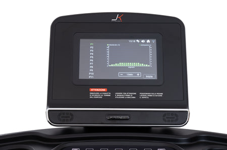 Il quadro di comando del nuovo JK 194 è composto da uno schermo LCD HD da 10”, per mantenere sotto controllo tutti i parametri dell’allenamento cardio quali: tempo, distanza, velocità, inclinazione, calorie bruciate, n° passi, frequenza cardiaca; inoltre, l’ampio touch-screen enfatizza con video di paesaggi reali precaricati, l’allenamento a casa, dando la sensazione di essere “all’aperto”! Il tapis roulant JK 194 è dotato di due sensori integrati: ricevitore per collegare i propri devices elettronici (per collegamenti a APP, social e musica); e ricevitore 5.3 KH per la rilevazione della frequenza cardiaca mediante la fascia cardio toracica JK offerta di serie.