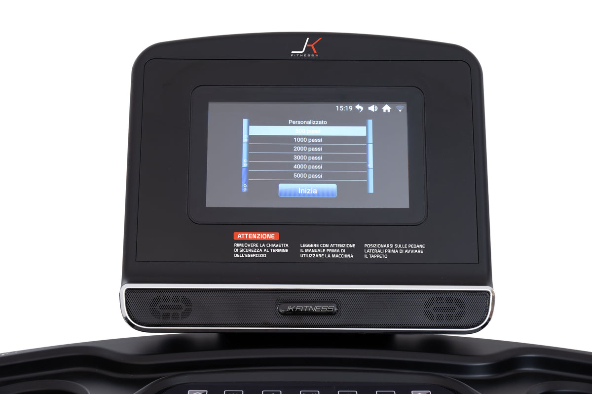 Il tapis roulant JK 194 è una macchina cardio che si adatta al livello di fitness di ogni utilizzatore, essendo equipaggiato di una serie di programmi per rendere ogni allenamento, il “tuo” allenamento! Sono in dotazione: 1 programma manuale dove tutte le funzioni sono interamente gestite dall’utilizzatore in ogni momento; 4 programmi a target con obiettivi pre-determinati per raggiungere una durata in minuti, una distanza in km, un numero passi e un consumo di energia calorie; 1 target n° giri di pista 400 m; 36 programmi pre-impostati con la variazione combinata fra velocità ed inclinazione; 1 HRC con target determinato dall’utente e possibilità di fissare la velocità massima; 1 User programmi personalizzabili dall’utilizzatore stesso, ovvero bisogna impostare ogni singolo step del programma determinando velocità ed inclinazione; 3 virtual wolrd tour.